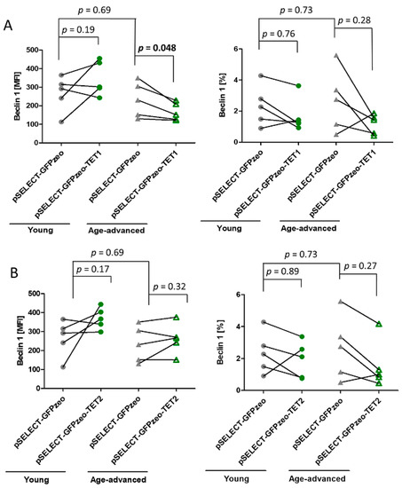 Effects of TET1 and TET2 overexpression on the autophagy marker Beclin 1 in fibroblasts obtained from young (n = 5) and age-advanced (n = 5) study participants. (A). TET1 overexpression-related changes in the expression of Beclin 1 and percentage of cells expressing this protein. (B). TET2 overexpression-related changes in the expression of Beclin 1 and percentage of cells expressing this protein. Statistical analysis was performed using the Mann-Whitney U test (young pSELECT-GFPzeo vs. age-advanced pSELECT-GFPzeo) and Wilcoxon matched-pairs signed rank test (pSELECT-GFPzeo vs. pSELECT-GFPzeo-TET1 or pSELECT-GFPzeo-TET2). MFI—mean fluorescence intensity.