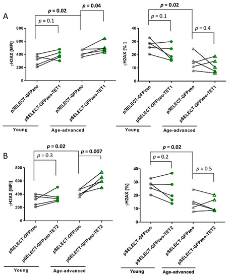 Upon the overexpression of TET1, the level of γH2AX increased by 19% (p = 0.04) in cells originating from age-advanced donors, while it remained unaffected in cells from young donors. The percentage of γH2AX-expressing cells did not change in either age group (Figure 4A). The overexpression of TET2 increased the γH2AX expression by 46% (p = 0.007) in cells of age-advanced donors, while it did not affect γH2AX levels in cells originating from younger study participants. The percentage of γH2AX-positive cells did not change in either age group (Figure 4B).