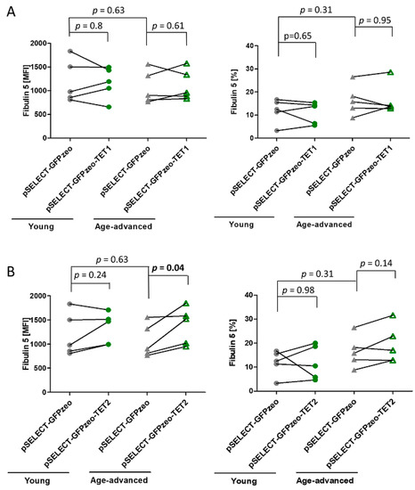 Analysis of the expression of Fibulin 5, a protein synthesized and secreted by fibroblasts, revealed no age-associated differences in control cells. The overexpression of TET1 did not influence the level of Fibulin 5 expression or the percentage of cells expressing this protein in both age groups (Figure 5A). In turn, the overexpression of TET2 increased Fibulin 5 expression by 29% (p = 0.04) in cells originating from age-advanced donors, without increasing the number of cells expressing this protein. Meanwhile, fibroblasts obtained from young donors remained unaffected by TET2 overexpression (Figure 5B).