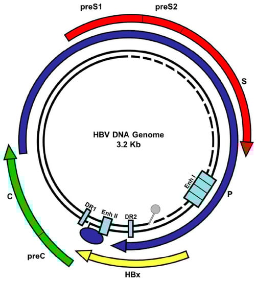 The human hepatitis B virus (HBV) is a membrane-enveloped DNA virus classified as a member of the viral family Hepadnaviridae. Its main distinguishable characteristic is the replication of its genome through a reverse transcription process. As shown in Figure 1, the HBV circular genome encodes only four overlapping reading frames, encoding for the main canonical proteins named core, P, surface, and X (or HBx protein) [].