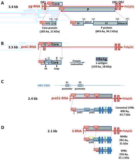 HBV mRNAs and their coding capacity. (A) pg-RNA, 3.4 kb. pg-RNA is organized in a bi-cistronic arrangement where the first AUG is encoding for core, and downstream, in a different reading frame, the AUG codes for the P protein. Core and P proteins are shown with their main domain organizations. (B) preC-RNA, 3.5 kb. preC protein starts translation upstream to the core’s AUG, but in the same reading frame. Sites for cleavage events (ER and Golgi apparatus) on the immature protein are shown. As a result, HBeAg is a secreted protein. (C) preS1-RNA, 2.4 kb. At the top, HBV DNA is shown with the relative locations of S1 and S2 promoters. preS1-RNA is predicted to encode the canonical LHBs, although other AUGs are present in the same reading frame (see the text). LHBs is shown with its domains preS1, preS2, and S. Both preS1 and S domains bear PTMs as shown. (D) S-RNA, 2.1 kb. S-RNA is predicted to encode both preS2 and S domains where MHBs and SHBs are produced.