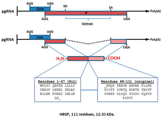 This protein is produced from a single splicing event, and it is encoded by the 2.2 kb singly spliced 1 (sp1) RNA molecule of the HBV pg-mRNA transcript. HBSP is usually identified as the “eighth HBV protein”. The N-terminal amino acids of the HBSP sequence are identical to those of the viral polymerase (47 aa), whereas the C-terminal amino acids (64 aa) are unique because of the splicing event (Figure 3).