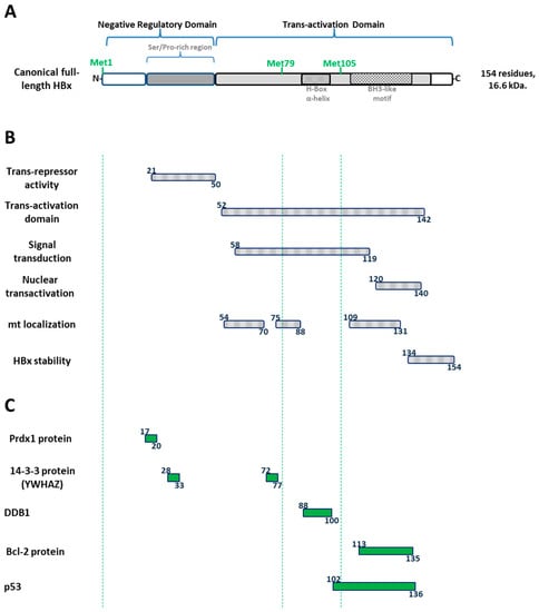 Canonical HBx protein corresponds to the smallest gene (465 nucleotides, 154 amino acids, and 16.6 kDa) and it is the only regulatory protein of HBV. The protein is common to all the mammalian members of the Hepadnaviridae family, including woodchucks, but absent in avian viruses such as DHBV (e.g., GenBank K01834.1). The HBx protein is essential for viral replication and HBV infection [,,]. The multifunctional HBx protein is organized into two distinct functional domains (Figure 4A) [,,].