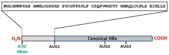 In 1990, Loncarevic et al. reported the finding of a unique HBx variant in five HBV DNA replication-competent clones isolated from HCC patients [,]. All these variants included an N-terminal extension of 56 amino acid residues in comparison to the canonical protein (Figure 6).