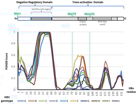 For these reasons, we utilized a well-known web server, Predictor of Natural Disordered Regions (PONDR VL-XT) [,], to conduct analyses of predicted disordered regions of the full-length amino acid sequence of the canonical HBx protein. For each of the ten HBV genotypes (genotypes A to J) that have been described, we used one reference genome sequence []. Results using default parameter-based analysis are depicted in Figure 7.