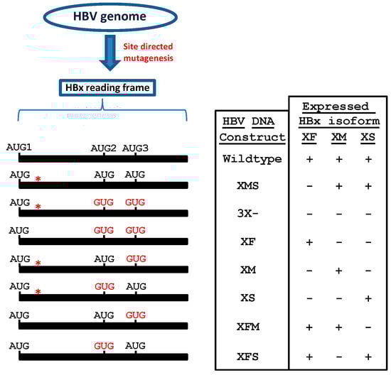 By introducing several point mutations directly into the HBV HBx DNA, we were able to target the expression of all HBx isoform proteins, either individually or in any possible combination, and we were able to investigate the HBx isoform during viral replication []. Figure 8 outlines the different HBV constructs, as well as the anticipated isoform proteins expressed by each viral construct.