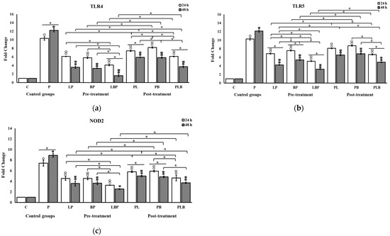The effect of Lactobacillus and Bifidobacterium cocktails on the mRNA expression of (a) TLR4, (b) TLR5, and (c) NOD2 in HT-29 cells exposed to Gram-negative bacteria. Gene expression levels were measured using qRT-PCR after 24 and 48 h of treatment. All results are reported as mean ± SD (n = 3) and p < 0.05. C: control; P: pathogen; L: Lactobacillus; B: Bifidobacterium; the order of letters indicate treatment order (e.g., BP indicates pre-treatment cocktail of Bifidobacterium). ○ indicates significant difference to control (C). □ indicates significant difference to pathogen (P). * indicates significant difference between treatment setups.