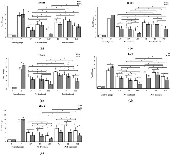 The effect of probiotic cocktails on the expression level of downstream genes related to the NF-κB pathway (a) MyD88, (b) TIRAF6, (c) IRAK1, (d) TAK1, and (e) NF-κB in HT-29 cells infected with Gram-negative bacteria. Gene expression levels were measured using qRT-PCR after 24 and 48 h of treatment. All results are reported as mean ± SD (n = 3) and p < 0.05. C: control; P: pathogen; L: Lactobacillus; B: Bifidobacterium; the order of letters indicate treatment order (e.g., BP indicates pre-treatment cocktail of Bifidobacterium). ○ indicates significant difference to control (C). □ indicates significant difference to pathogen (P). * indicates significant difference between treatment setups.