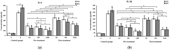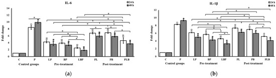 The effect of probiotic cocktails on the secretion of (a) IL-6 and (b) IL-1β cytokines from HT-29 cells exposed to Gram-negative bacteria. Cytokine levels were measured using ELISA after 24 and 48 h of treatment. All results are reported as mean ± SD (n = 3) and p < 0.05. C: control; P: pathogen; L: Lactobacillus; B: Bifidobacterium; the order of letters indicate treatment orders (e.g., BP indicates pre-treatment cocktail of Bifidobacterium). ○ indicates significant difference to control (C). □ indicates significant difference to pathogen (P). * indicates significant difference between treatment setups.