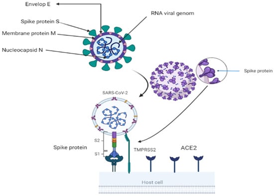 A toddler with a cold was the first discovered with coronavirus in 1965. Under an electron microscope, the spike glycoprotein on the virus’s surface resembled a crown, thus the name corona. Researchers have identified two essential encapsulating proteins. When a spike or S-protein attaches to cell receptors, cells fuse. M (matrix) is a second glycoprotein that aids in the formation and expansion of the viral membrane [5]. The virus is a single-strand RNA with a 3′-polyA tail and 5′-cap. It has a positive sense range between 26 and 32 Kbp (with an average of 29.8 Kbps). All 29-5′-terminal proteins are encoded by 7–14 open reading frames (ORFs). These ORFs include transcription regulatory areas and leader RNA at the conclusion of transcription. The sub-genomic RNAs ORF1a and ORF1b come together to form a replication–transcription complex. This complex is necessary for building a structure composed of nonstructural proteins (nineteen non-structure proteins) [3,6]. The 3′-terminus of the genome codes for the spike, envelope, membrane, and nucleocapsid proteins [7]. The 150-kilodaltons S protein assists the virus in attaching to the host cell membrane, which contains the viral fusion receptor. S protein is the most prevalent immune ectodomain [8]. S1 attaches to the host cell’s receptors, whereas S2 fuses with cellular membranes. These two components are responsible for the infection of coronaviruses. The trimeric S1 lies atop the S2 stalk (Figure 1). S1 components distinguish coronaviruses [9]. The N terminal domain (NTD) and C terminal domain (CTD) are found in S1 (CTD). CTDs include RBMs (receptor-binding motifs) [10,11]. CoVs-receptor-binding domain (RBD) and its receptor target the angiotensin-converting enzyme2 (ACE2) peptide component [12]. CoV genomes can alter RBD [13]. The viral envelope is formed by structural protein M, having a molecular weight of 25–15,000 kilo Daltons. During replication, M and S (NTD) form the endoplasmic reticulum–Golgi intermediate compartment (E–GIC) complex. The substance diffuses into the endoplasmic reticulum (ER) and gastrointestinal (GI) tracts [14,15]. The E protein, a tiny structural protein ranging in size from 8 to 12 kilo Daltons, contributes to virion assembly, budding, and production [16]. N protein forms a compound with viral DNA to help M protein in viral assembly and transcription [17]. There are three traditional portions. The NTD domain, the first domain, is brief and concise. They are connected electrostatically to the 3′ terminal. The second domain is an RNA-binding domain or serine and arginine-rich flexible linker region (LKR). It influences cellular signaling and interferon production [18]. Incorporating spike proteins into the viral envelope assists viral entrance into specific cells (Figure 1). The surface unit S1 attaches to a cellular receptor, while the transmembrane unit S2 aids the fusion of the viral membrane with the cellular membrane. For membrane fusion, host cell proteases cleave the S protein at the S1/S2 and S2 locations. This cleavage induces membrane-fusing S protein activity [19,20,21]. The constitutive secretory route of infected cells or viral entrance into target cells may break the S protein, which is required for viral pathogenicity [19,22].