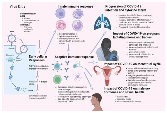 It has been demonstrated that females and males react inversely to numerous viral infections in various mammalian species. Gender influences both the incidence and severity of viral infections. It has been reported that males are more susceptible to this condition than females. This distinction results from a highly complex system incorporating behavioral, genetic, hormonal, and immunological components. According to this theory, the most recent data on COVID-19 mortality indicates that men are more susceptible to the disease than women. Complications, such as hypertension, diabetes, renal disease, and cardiovascular disease, are also strongly linked with the COVID-19 death rate. These disorders are closely related to smoking and alcohol consumption, significantly associated with males, particularly in African and Asian countries. Sex hormones and specific X-linked genes may also contribute to this difference in COVID-19 outcomes based on gender. These genes influence both innate and adaptive immune responses against viral infections. In addition, the androgen-independent expression of TMPRSS2 may contribute to the high prevalence of COVID-19 in males. Epidemiological data on SARS indicated that males were more susceptible to the disease. Thus, research on SARS-infected animals revealed that male rodents are more susceptible to infection with SARS-CoV-2 and confirmed the protective effect of estrogen signaling against the pathogenesis of SARS. Infection by COVID-19 showed several defects in sexual desire and sexual activity, such as ED. Infection increased the cases of stillborn and abortions and the risk of ICU admission for pregnant females. On the other hand, none of the candidate vaccines showed any effect on sexual activity for both genders. Figure 3 summarizes the impact of COVID-19 infection on males and females.