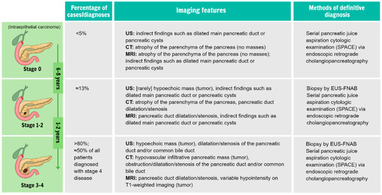 The primary imaging modalities currently used to diagnose pancreatic cancer are CT, MRI, and EUS. Among these methods, CT is the most widely available and best-validated tool for imaging PDAC. Several national and international cancer guidelines suggest using CT as an initial imaging modality for cases of suspected pancreatic cancer. Moreover, a dedicated CT protocol was developed specifically for pancreatic lesions [14]. This protocol provides a standardized template for reporting that specifies the terminology to be used for solid pancreatic neoplasms, with the aim of improving the patient-management decision-making process and optimizing treatment recommendations. A meta-analysis of different imaging modalities found that the sensitivity and specificity of CT for detecting pancreatic lesions were both approximately 90% [15]. CT can also detect local atrophy/fatty metamorphosis of the pancreatic parenchyma at the early stages of disease [16,17]. MRI allows the detection of the morphological changes of the pancreatic duct and pancreas parenchyma, which can facilitate the detection of pancreatic lesions at earlier stages, although the previously mentioned meta-analysis found it to be equally sensitive and specific as CT (sensitivity and specificity of approximately 90%) [15]. Thus, because of its increased cost and limited availability, MRI is not as widely used as CT for diagnosing pancreatic cancer. Finally, EUS allows detailed, high-resolution imaging of the pancreas and surrounding vessels and lymph nodes. Ikemoto et al. reported that EUS enabled a significantly higher rate of detection in patients with stage IA tumors than CT or MRI and that EUS detected masses in more than half of the patients in whom a mass was not detected by CT or MRI [18]. It was also reported that EUS has a diagnostic sensitivity of 94.4% for detecting small PDACs (<20 mm) [19]. Yasuda et al. reported that, among 132 patients with risk factors for PDAC without masses detected on CT, pancreatic tumors were detected by EUS in 3 patients [20]. Clinical guidelines issued by the Japan Pancreas Society in 2019 stated that EUS should be performed at institutions with highly skilled operators [21]. Most importantly, EUS can be paired with fine-needle aspiration (FNA) or fine-needle biopsy (FNB) to facilitate a cytopathological diagnosis. The accuracy of both EUS-FNA and EUS-FNB for diagnosing pancreatic cancer is extremely high, with a recent analysis finding that of both to be >80% [22,23]. EUS-FNA/FNB can also be useful in cases where masses are indistinct on other imaging platforms. The imaging features of PDAC at different stages are summarized in Figure 1.