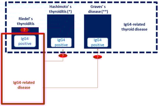 Riedel’s thyroiditis (RT), being strongly connected with positive antibodies against the thyroid, has been traditionally regarded as a particular type of autoimmune thyroiditis. However, during the last decade, RT was assimilated into the larger spectrum of immunoglobulin IgG4-related disease (IgG4-RD) and, recently (in 2021), a proposal was released to designate a particular framework, namely, IgG4-related thyroid disease (IgG4-RTD) with four underlying entities: IgG4-mediated RT, IgG4-associated Hashimoto’s thyroiditis (and its fibrotic variant), and IgG4-related Graves’s disease [,,] (Figure 1).