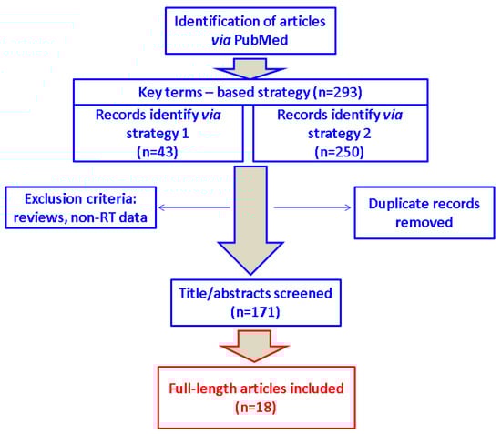 We identified 293 articles (43 according to strategy 1, and 250 through strategy 2) and selected 18 original papers for the final analysis (nine case reports, four case series, three studies on IgG4-RD, and two studies on IgG4-RTD) (Figure 2).