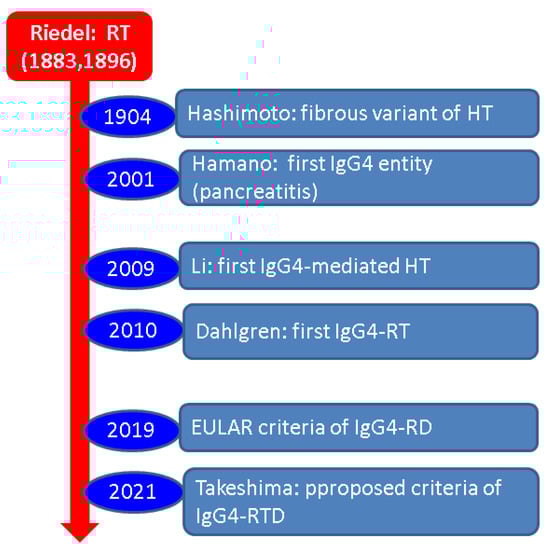 A timeline perspective of Riedel’s thyroiditis: considerations on IgG4 profile. Dr. Riedel first described Riedel’s thyroiditis (1883) and published it later (1896) [,]. Hashimoto described a fibrous variant of Hashimoto’s thyroiditis (1904) []. Hamano et al. described the first case of IgG4-associated disease (in the pancreas) in 2001 []. Li et al. discovered the first case of IgG4-associated Hashimoto’s thyroiditis in 2009 []. One year later, Dahlgren et al. identified the first three cases of IgG4-related RT []. The most recent guideline for IgG4-RD was released by EULAR in 2019, including data on the thyroid [,]. The proposed criteria for IgG4-RTD are published in 2021 []. Abbreviations: Ig = immunoglobulin; HT = Hashimoto’s thyroiditis; RT = Riedel’s thyroiditis; RD = related disease; and RTD = related thyroid disease.