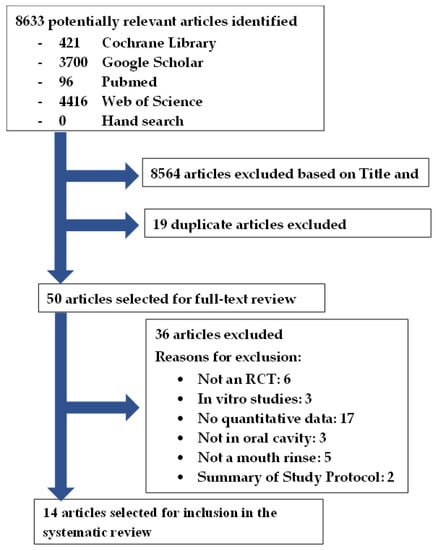 The search yielded 8633 studies: 421 in Cochrane Library, 3700 in Google Scholar, 96 in PubMed, 4416 in Web of Science, and no additional articles from hand searching of the reference list of the selected articles (Figure 1). After the title and abstract screening, the duplicates were removed, and 50 articles remained for full-text analysis. After full-text analysis, 36 were eliminated: 6 for not being a randomized trial [,,,], 3 for being an in vitro study [,,], 17 for not having quantitative data of viral load [,,,,,,,,,,,,,,,,], 3 for not being in the oral cavity [,,], 5 for not being a mouth rinse [,,,,], and 2 for being a summary protocol [,]. Finally, 14 articles were selected for data extraction [,,,,,,,,,,,,,].