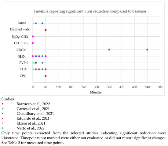 Timeline of significant difference in SARS-CoV-2 reduction after rinsing with antiseptic compared to baseline [,,,,,].