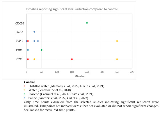 Timeline of significant difference in SAR-CoV-2 reduction after rinsing with antiseptic compared to control [,,,,,,].