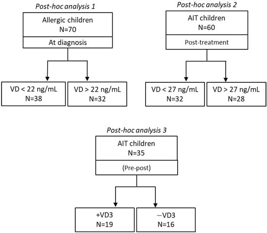 Evidently, the role of endogenous VD in allergy severity and AIT has not been clearly assessed so far. Previously, our group described an adjuvant role for VD3 supplementation in a murine model of type I mite allergies when administered in combination with Der p 1 immunotherapy [20]. Starting from these premises, three data sets regarding three cohorts of allergic children (eligible or not for AIT) were retrospectively analyzed to assess whether endogenous VD or supplemented VD3 might contribute to ameliorating the clinical outcome and/or promoting the functionality of regulatory T cells in this unexplored setting.