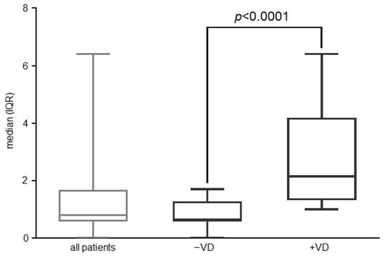 The clinical and laboratory data were expressed as means ± standard deviations (SD), unless otherwise indicated. All the measured parameters showed a non-parametric distribution, according to Shapiro–Wilk’s criteria. A statistical comparative analysis between two datasets, below and above the VD cut-off value or ±VD3 food supplement, was performed using the Wilcoxon signed-rank test. Statistical analyses were performed using the program Statistical Package for Social Science (SPSS, Chicago, IL, USA). p Values < 0.05 were considered statistically significant.