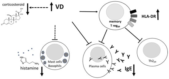 Vitamin D3 (1,25-dihydroxy vitamin D, VD3), the active form of vitamin D, is a compelling immunoregulatory molecule [1]. Immune cells are sensitive to VD3 after it binds to the cytoplasmic vitamin D receptor (VDR), which allows it to enter the nucleus, where it forms a new complex with the retinoic acid receptor (RXR). In this way, VD3-VDR-RXR binds to VD response elements (VDRE) located in the promoter of genes playing immune stimulatory or inhibitory roles. VDR is expressed constitutively by antigen-presenting cells (APCs) such as macrophages and dendritic cells (DCs), and in an inducible way by activated T regulatory cells (Tregs). Monocytes, macrophages, and T cells can occasionally express enzymes (CYP27A1 and/or CYP27B1) that catalyze the conversion of the inactive precursor into active VD3. Immune-cell-produced VD3 acts locally in an autocrine or paracrine way to regulate the immune response, and it exerts pleiotropic effects on both innate and acquired pathways of immunity [2,3]. In macrophages and monocytes, VD3 positively regulates its own effects by increasing the expression of VDR and activating enzymes; it also induces monocyte proliferation and the expression of pro-inflammatory interleukin (IL)-1 by macrophages. VD3 hinders the maturation of DC, causing a switch in the cytokine production pattern and resulting in lower amounts of pro-inflammatory IL-12 and higher levels of inhibitory/regulatory IL-10. An additional notable effect of VD3 on innate cells is a reduction in IL-4 release [4], a typical cytokine involved in allergic responses. Furthermore, VD3 attenuates the proliferation of CD4+ (helper) and the detrimental activity of CD8+ (cytotoxic) effector T cells, influencing the decreased production of the cytokine IL-2, which plays a role in the pan T cell growth factor, and the pro-inflammatory interferon γ (IFN-γ), the Th1 cell differentiation factor. Furthermore, VD3 blocks B cell proliferation, differentiation, and immunoglobulin production [4] and indirectly blocks the activity of Th2 cells, effector allergen-specific cells involved in allergic responses. Most importantly, VD3 promotes the development of innate and IL-10-producing inducible Tregs, which play pivotal roles in allergy development and control [5]. The induction of a durable tolerance towards an allergen is the main scope of allergen immunotherapy (AIT), which is the only treatment shown to have this capacity. The mechanistic interplay is accepted to rely on the elicitation of several subtypes of central and peripheral allergen-specific Tregs that, consequently, increase the production of the inhibitory cytokine IL-10 and transforming growth factor β (TGF-β). Lastly, AIT can suppress aberrant Th2 responses and induce an isotype switch of allergen-specific IgE to IgG production by plasma cells [6,7].