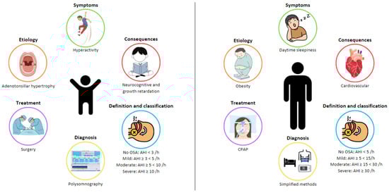 OSA is characterized by recurrent events of partial (hypopnea) or complete (apnea) obstructions in the UA, which disrupt normal oxygenation, ventilation, and sleep patterns [1,3,4,5]. OSA in children has a clear entity with profiles that are very different from adults in terms of etiology, clinical presentation, and consequences (Figure 1). For this reason, a specific definition, diagnosis, and treatment approach is needed for this specific population.