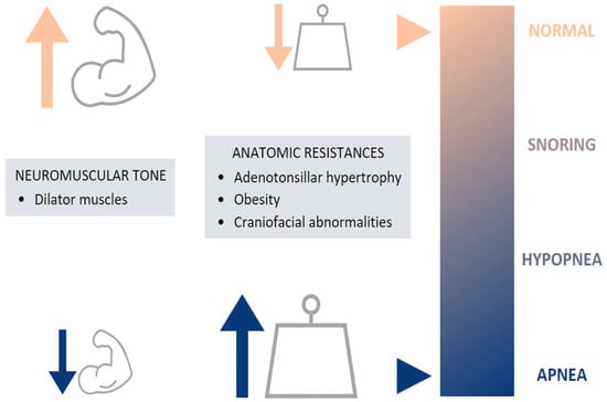 The etiology of childhood OSA is multifactorial, involving many risk factors, which can increase UA narrowing and collapsibility and which may contribute to the pathogenesis of OSA [8,9,10]. This includes both anatomical and neuromuscular disturbances, leading to increased airway resistance and preventing the normal function of the dilator muscles, respectively [5] (Figure 2).