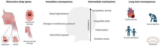 OSA in children is associated with a number of adverse morbidities, presented as behavioral and neurocognitive disorders, growth retardation, cardiovascular (CV) diseases, and metabolic consequences, producing a negative impact on quality of life. These consequences are derived from the presence of continuous episodes of hypoxia/resaturation, sleep fragmentation, and/or changes in the intrathoracic pressure. These immediate consequences develop a cascade of intermediate mechanisms, mainly alterations in sympathetic activity, coagulation, inflammation, and oxidative stress (Figure 3).
