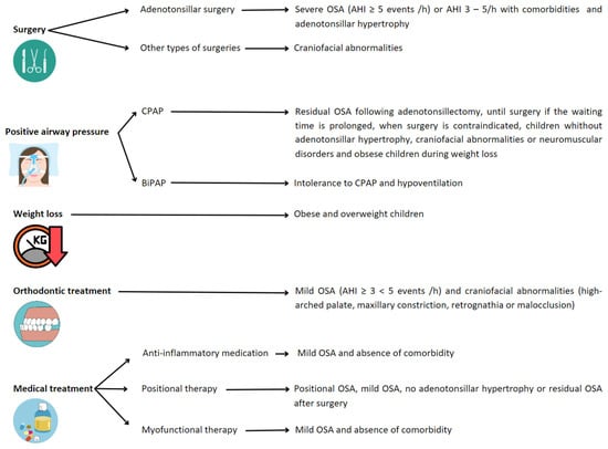 The goal of OSA treatment is complete resolution of SDB. This may require combining strategies (Figure 4), although the first-line treatment for OSA in children is adenotonsillar surgery [5] when adenotonsillar hypertrophy is present. Nonetheless, in the recent past, this treatment has been questioned. Recent publications have shown that the use of adenotonsillectomy in pediatric OSA patients may have variable results, reaching an AHI of 1 or less in about 50–70% of cases, but its efficacy decreases with risk factors such as age (<7 years), severe disease, chronic asthma or obesity. Persistent disease is present in 20–75% of children, with more than half having habitual snoring [7,43,44]. In addition, other surgical procedures may be performed in selected cases, such as septoplasty, uvulopharyngopalatoplasty, epiglottoplasty, glossopexy, and maxillomandibular surgery.