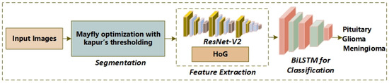 A brain tumor refers to an abnormal growth of cells in the brain that can be either benign or malignant. Oncologists typically use various methods such as blood or visual tests to detect brain tumors, but these approaches can be time-consuming, require additional human effort, and may not be effective in detecting small tumors. This work proposes an effective approach to brain tumor detection that combines segmentation and feature fusion. Segmentation is performed using the mayfly optimization algorithm with multilevel Kapur’s threshold technique to locate brain tumors in MRI scans. Key features are achieved from tumors employing Histogram of Oriented Gradients (HOG) and ResNet-V2, and a bidirectional long short-term memory (BiLSTM) network is used to classify tumors into three categories: pituitary, glioma, and meningioma. The suggested methodology is trained and tested on two datasets, Figshare and Harvard, achieving high accuracy, precision, recall, F1 score, and area under the curve (AUC). The results of a comparative analysis with existing DL and ML methods demonstrate that the proposed approach offers superior outcomes. This approach has the potential to improve brain tumor detection, particularly for small tumors, but further validation and testing are needed before clinical use.