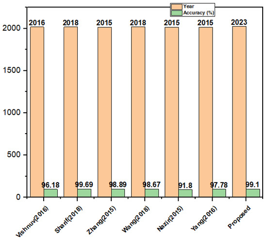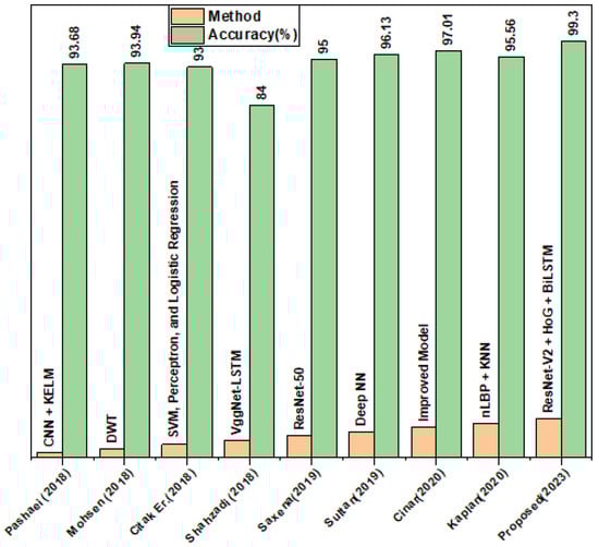 In this unit, we showcase various deep learning-based approaches for detecting and classifying brain tumors. We conducted an experiment to evaluate the accuracy of our proposed features fusion-based method compared to existing algorithms, and we reported the findings in Table 10. Our segmentation and features fusion-based approach performed exceptionally well, achieving an accuracy of 99.3%, which outperforms all other existing methods, including [26], which achieved the second-highest accuracy of 97.01%. In contrast, the lowest accuracy of 84% was obtained by [38], which utilized the VggNet-LSTM classifier. Our experiment clearly demonstrates that our proposed technique excels in segmentation, feature extraction, and brain tumor classification. Figure 6 displays the comparative plot of our results.