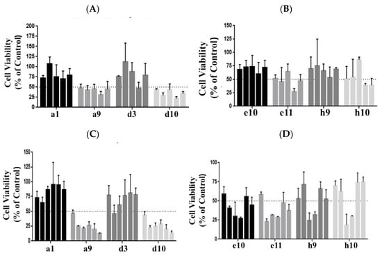 A number of molecules were tested in the PANC-1 and BxPC-3 cell lines at various concentrations (ranging from 0.05 µM to 10 µM). As shown in Figure 1A,B, the kinase inhibitors labeled a9 and d10 showed potent inhibition of viability in PANC-1. Upon testing in the BxPC-3 cell line, a similar inhibition was observed for the inhibitors a9 and d10; see Figure 1C,D. The kinase inhibitor a9 from the library was identified as an ‘Aurora kinase inhibitor,’ abbreviated AT, and d10 as an ‘EGFR kinase inhibitor,’ abbreviated WZ. Both the kinase inhibitors showed over 50% inhibition in the initial screening experiments. Therefore, further in-depth studies were carried out with these two types of inhibitors.