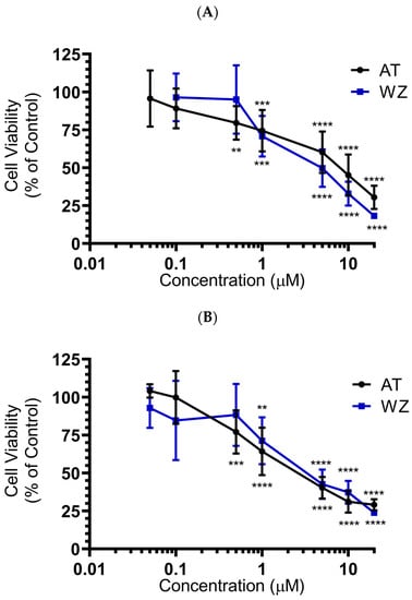 Impact of AT and WZ on PANC-1’s and BxPC-3’s cell viability. (A) PANC-1 cells were treated with various concentrations of AT and WZ, and their effect on the cell viability was tested as described in ‘Section 2’. Cell viability was expressed as a percentage of control cells. The experiments were performed in triplicates, and the mean of three independent experiments was calculated. A significant decrease in cell viability was observed, with p-values of ** = 0.0021, *** = 0.0002 and **** < 0.0001. (B) Similar assays were performed on BxPC-3 cells with p-values of ** = 0.0021, *** = 0.0002 and **** < 0.0001. Both PDAC cell lines showed potent dose-dependent inhibition of viability.