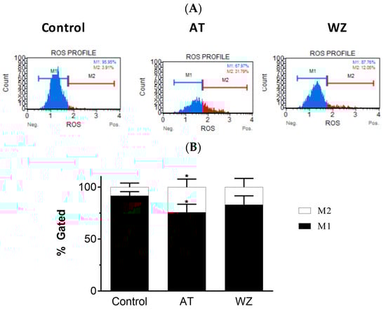 Effect of the kinase inhibitors AT and WZ on the levels of ROS (superoxide radical) in PANC-1 cells. PANC-1 cells were plated in a 12-well plate at a density of 62,500 cells/well. After 24 h, cells were treated with the AT (8 µM) and WZ (5 µM) and incubated for 72 h. Three independent experiments were performed. (A) Representative oxidative stress plots of control and treated group. M1 represents the ROS(−) cell population, and M2 represents the ROS(+) cell population. (B) The % gated profile of the control and treated group. * = p-value of 0.0148 for M1 cell population and 0.0248 for M2 cell population for the AT treated sample as per 2-way ANOVA with Dunnett’s multiple comparison test.