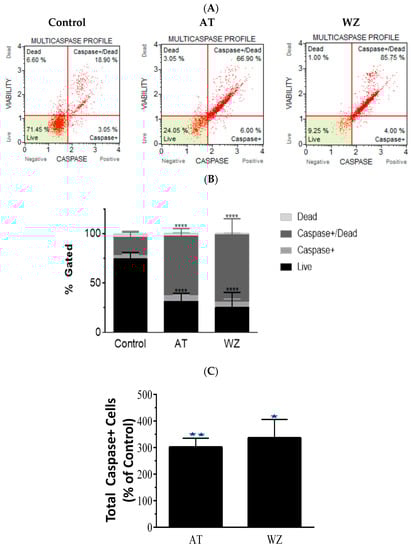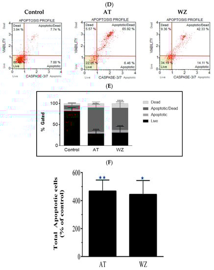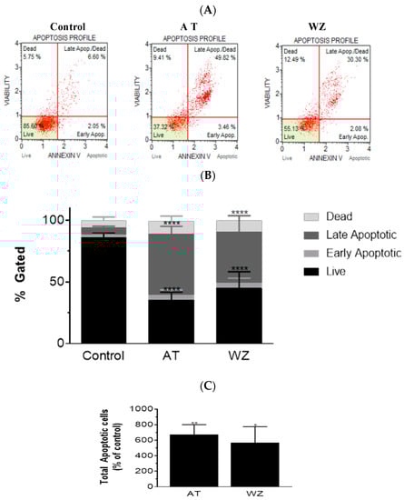 On observing an increase in superoxide radical levels in the AT and WZ-treated cells, we proceeded to investigate whether the two kinase inhibitors invoked the programmed cell death pathway. To assess the programmed cell death pathway, the Annexin V flow cytometric assay was performed; by using this technology, the population of cells that were affected by the kinase inhibitors could be assessed. Cells were treated with 8 µM of AT and 5 µM of WZ and incubated at 37 °C for 72 h. Representative scatter plots are shown in Figure 4A. The % gated profile compared to the control is represented by a bar diagram; see Figure 4B. Upon normalization to the control group, a statistically significant increase in apoptotic cells was observed in both the AT- and the WZ-treated group; see Figure 4C.