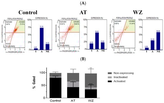 The key survival molecule Bcl-2 was impacted by treatment with AT and WZ. PANC-1 cells were plated in a 12-well plate at a density of 62,500 cells/well. After 24 h, cells were treated with 8 µM AT and 5 µM WZ and incubated for 72 h. Three independent experiments were performed. Control (untreated samples) were maintained in parallel. (A) Representative scatter plots of the control and AT- and WZ-treated samples, along with the percentage of activated, inactivated, and non-expressing Bcl-2 cell populations, abbreviated as A, I and NE respectively, are represented by a bar graph. (B) % gated profile of all the samples with p-values indicated by ** = 0.0037 for the activated population in AT-treated samples, *** = 0.0005 for the activated population of WZ-treated group, and ** = 0.0023 for the non-expressing population in WZ treated group, as per 2-way ANOVA with Dunnett’s multiple comparison test.