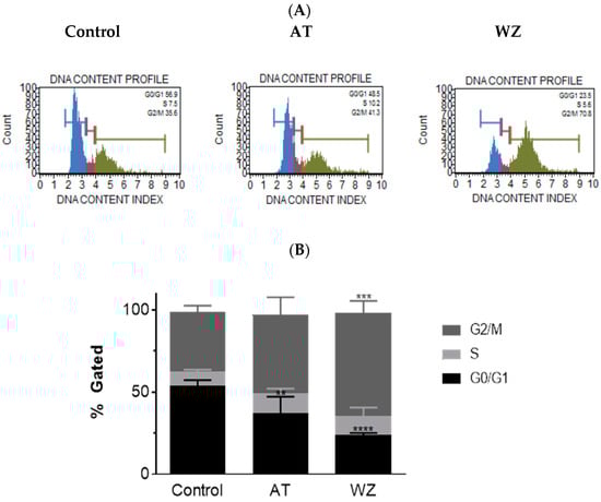 We further investigated whether AT and WZ had an effect on the different phases of the cell cycle of PANC-1 cells. To analyze the population of cells affected, a cell cycle analysis was performed. Representative plots of the control group and the AT- and WZ-treated groups are represented in Figure 7A. A statistically significant decrease in the G0/G1 phase of the cell cycle was observed in the AT-treated group. A decrease in cells in the G0/G1 phase, as well as an increase in the G2/M phase, was observed in the WZ-treated group, as shown in Figure 7B.