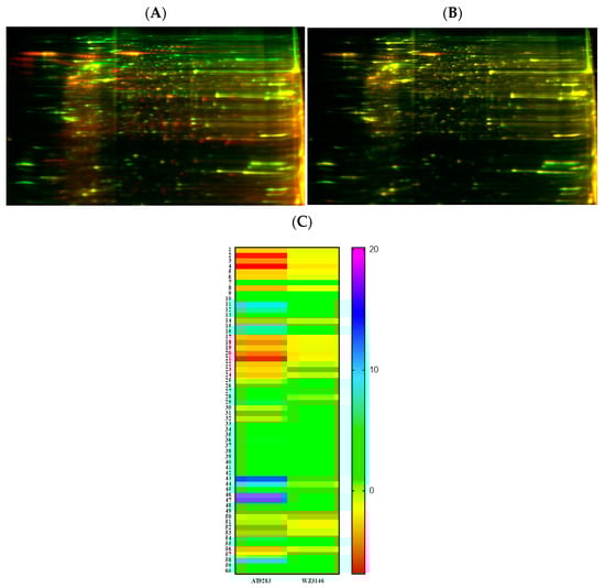To understand the mechanism of action and further delineate the key entities that could be impacted by AT and WZ, we employed sensitive methodologies such as 2D gel electrophoresis and mass spectrometric analysis to perform ‘Protein profiling’. Two-dimensional gel electrophoresis of AT- and WZ-treated groups and the control group was performed (as described in Section 2.4). The cell lysate of the control group was combined with Cy2 dye, and the treated group was combined with Cy3 dye. An overlay of the gels exhibited differentially regulated proteins. The overlay of the control gel on the AT-treated gel is shown in Figure 8A and the overlay of the WZ-treated gel and control gel is shown in Figure 8B. The heatmaps of AT- and WZ-treated groups are shown in Figure 8C.