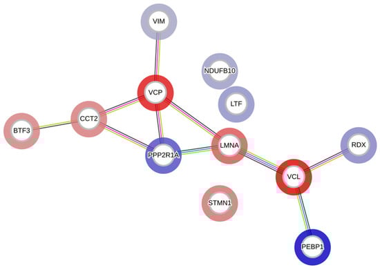 A protein–protein interaction network generated using the STRING database. Each node represents a differentially regulated protein from the AT-treated group. The blue color indicates upregulation, and the red indicates downregulation. The edges represent either known or predicted interactions, with a minimum required interaction score of 0.4 in the STRING database. The abbreviations in the above figure are mentioned in Table 1.