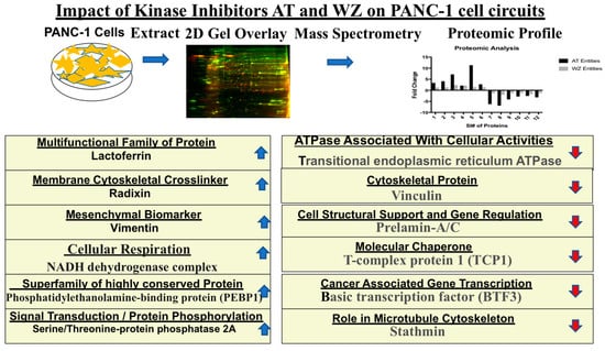 Vimentin is expressed in mesenchymal tissue and is a marker of mesenchymal differentiation, but occasionally, epithelial cells that acquire mesenchymal phenotype express vimentin [56]. Studies carried out on patients with pancreatic cancer have shown poor survival in the presence of vimentin. Interestingly, a subset of patients exhibit autoantibodies to isoforms of vimentin, and their detection has been utilized for early diagnosis of pancreatic cancer [57]. One of the entities upregulated by AT and WZ in the present study was vimentin. Therefore, antibodies against vimentin could be harnessed for early diagnosis and also as treatment with vimentin–drug conjugates in combination with the kinase inhibitors AT and WZ.