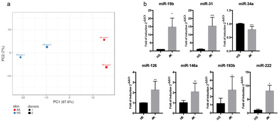 The principal component analysis (PCA) of the miRNA profiles was performed using the ClustVis website on ΔCt of all the miRNAs that were eligible for selection (Figure 1a). The miRNA dataset for each pool of samples was analyzed, and its variability was reduced and represented as a single dot on a first principal component PC1 vs. PC2 scatterplot. The PCA shows that the miRNA profiles of the two AK sample pools are different from the profiles of the two HS sample pools from the same donors. The PC1, which describes the majority of the variance, indicated that the miRNA datasets from the two AK pools were similar to each other but different from the miRNA datasets obtained from the HS pools. This suggested that the number of miRNAs with an altered expression in AK compared to HS was sufficient to allow for discrimination in PCA.