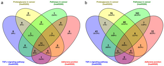 Given the elevated number of the AK modulated miRNAs involved in all the KEGG pathways, the significant overlap among miRNAs was confirmed by the Venn diagram, which showed that 31 miRNAs are commonly present in the four top regulated pathways (Figure 2a and Supplementary Table S1). Therefore, a Venn diagram was constructed to analyze the overlaps among the genes regulating TGF-beta signaling, Proteoglycans in cancer, Pathways in cancer, and Adherens junction. There is one high overlap of 60 genes among the miRNA targets controlling Proteoglycans in cancer and Pathways in cancer, but only 3 genes commonly regulate the top four pathways (Figure 2b and Supplementary Table S2).