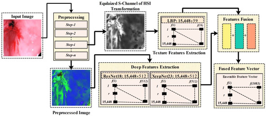 Feature Extraction and optimal feature selection are significant phases that are necessary to achieve the accurate detection and classification of GIT abnormalities. In this research, we have utilized the Local Binary Pattern for the texture features extraction, and two CNN model are utilized for the deep features extraction. In Figure 4, there is an overview of the phases from preprocessing features extraction, deep features extraction, and features fusion. Whereas in the preprocessing phase we have performed several steps such as data augmentation, box-filtering, median filtering, and RGB-to-HSI conversion, in the preprocessing block of Figure 4, step-i represents the extracted Equalized S-channel output of the preprocessing phase, and Step-n represents the final output image of the preprocessing phase. The equalized S-channel image is utilized for the LBP features extraction that is later ensembled with the extracted deep learning features. A block diagram representing the proposed features engineering process is given in Figure 4.