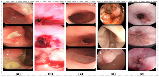 Sample dataset images: (a) Ulcer, (b) Bleeding, (c) Healthy, (d) Polyps, (e) Esophagitis.