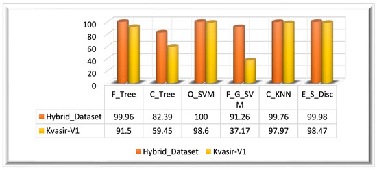 On the Kvasir_V1 dataset, the Q_SVM classifier achieved the second-highest accuracy of 98.37% in 36.044 s, and C_KNN achieved the thirst highest accuracy of 97.42%. F_G_SVM performed worst among all classifiers by achieving a 36.22% accuracy in 102.24 s. The graphical representation of the results is given in Figure 10 for both datasets.