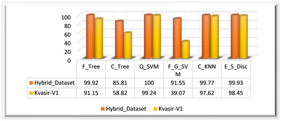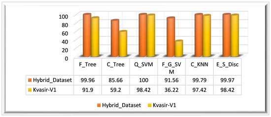 Similarly, preprocessed Kvasir-V1 images are utilized for feature extraction. The feature vectors obtained from the ResNet18 model and XcepNet23 are of dimensions, where symbolizes the total number of images in the Hybrid_Dataset. A feature vector of is obtained through the LBP. In the next step, feature fusion is performed to obtain a strong set of features. The ensemble feature vector obtained from the Kvasir_V1 dataset is of dimensions . A fused feature vector is produced when these three extracted feature vectors are an ensemble that is denoted by the ensemble feature vector is utilized for the classification. The highest classification accuracy achieved on the Kvasir_V1 dataset is 98.60% on the Q_SVM classifier in 41.758 s. With 98.47%, E_S_Disc achieved the second-highest accuracy, while C_KNN came in third with a 97.97% accuracy. The results of this experiment are depicted graphically in Figure 8 for both datasets.
