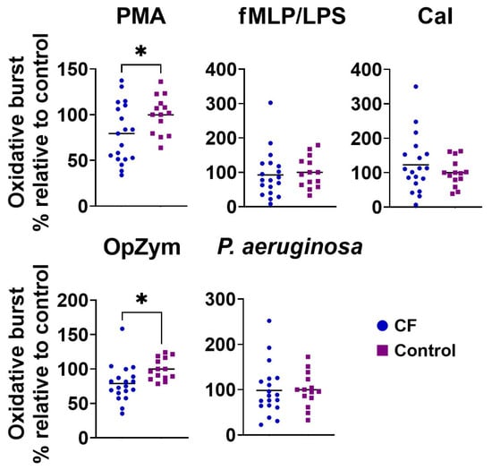 A chemiluminescence assay with luminol was used to detect ROS production. Neutrophil granulocytes that were isolated from the blood of CF patients and healthy children as previously described were resuspended in an HBSS medium with Ca2+ and Mg2+ enriched with 1% human inactivated serum and 10 mM HEPES (Sigma-Aldrich, Steinheim, Germany) and plated in a 96-well white plate (2.5 × 105/150 µL per well). After incubation (30 min at 37 °C), 50 µL of luminol (Serva, Munich, Germany) in HBSS medium was added to each well. After incubation (15 min at 37 °C), different stimuli were added: phorbol myristate acetate (PMA) (20 nM), calcium ionophore A23187 (CaI) (1 µM), opsonized zymosan (OpZym) (10 µg), N-formyl-methionyl-leucyl-phenylalanine (fMLP) (1 µM) + lipopolysaccharide (LPS) (100 nM), and P. aeruginosa at a multiplicity of infection of 10 (MOI 10). The simultaneous addition of LPS—as a neutrophile priming agent—and fMLP—as a triggering event—is a standard procedure for inducing ROS production or better stimulation of neutrophils [32]. All chemicals were from Sigma-Aldrich (Steinheim, Germany). P. aeruginosa, ATCC 9027 strain, was obtained from the ATCC collection in Rockville, MA, USA. The intensity of emitted light, which was proportional to the production of ROS, was measured immediately after stimulation with a chemiluminescent spectrometer (Synergy HTX, Bio Tek Instruments, Santa Clara, CA, USA). The release of ROS was monitored every 2 min for 3 h at 37 °C, and the values are shown as the area under the curve (AUC).