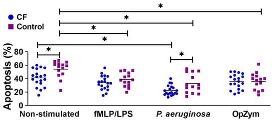 The spontaneous apoptosis of CF neutrophils was statistically significantly lower than that of the control neutrophils (Figure 2). All applied stimuli (fMLP/LPS, P. aeruginosa, or OpZym) significantly decreased the apoptosis of the control neutrophils compared to that of the non-stimulated cells (p < 0.05). However, adding P. aeruginosa to the culture of CF neutrophils decreased their apoptosis compared to that of non-stimulated CF neutrophils (p < 0.05). P. aeruginosa also decreased the apoptosis of CF neutrophils compared to that of control neutrophils that were treated similarly (p < 0.05). The differences in the apoptosis rates between CF and control neutrophils in the presence of other applied stimuli were not statistically significant (Figure 2).