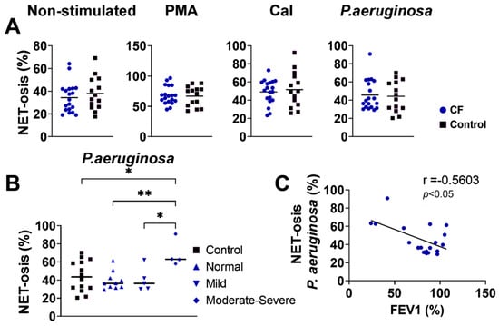 NET-osis was increased in the CF and control neutrophils upon the stimulation of the cells in culture with PMA. Other treatments did not significantly modify NET-osis. However, there were no significant differences in spontaneous or stimulated (PMA, CaI, P. aeruginosa) NET-osis between the CF and control neutrophils (p > 0.05) (Figure 3A). When the CF patients were divided according to the severity of the disease, neutrophils from those with moderate–severe CF treated with P. aeruginosa showed a higher degree of NET-osis compared to that of normal (stable) and mild CF or control neutrophils that were stimulated with P. aeruginosa (Figure 3B). The differences were not statistically significant when other stimuli were used. In this context, there was a negative correlation (r = −0.5603; p < 0.05) between the NET-osis of P. aeruginosa-stimulated CF neutrophils and FEV1 (Figure 3C). This correlation was not seen with other stimuli of CF neutrophils.