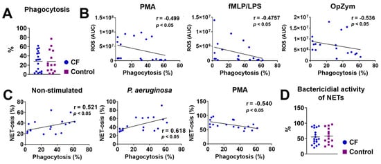 (A) Phagocytosis of P. aeruginosa by cystic fibrosis (CF) and control neutrophils. (B) Correlation between the ROS activity and phagocytosis of CF neutrophils. (C) Correlation between NET-osis and phagocytosis of CF neutrophils. (D) Bactericidal activity of NETs released from CF and control neutrophils. The detailed methodology is described in Section 2.10. PMA-phorbol myristate acetate; fMLP/LPS-N-Formyl-methionyl-leucyl-phenylalanine and lipopolysaccharide; OpZym-opsonized zymosan; Spearman’s rank correlation test (A–C) and Student’s t-test (D).